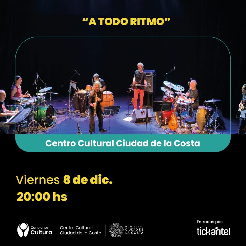 A TODO RITMO banda se presentan el 8 de diciembre a las 20 hs en el Centro Cultural Ciudad de la Costa con una propuesta que recorre la historia de la música uruguaya a través de sus géneros más representativos como el candombe y la murga, a cargo de exponentes de primera línea en un formato inédito en Uruguay a dos baterías.