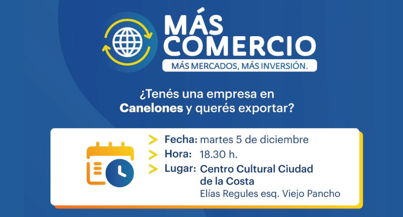Se realizará un nuevo taller dentro del programa más comercio en el Centro Cultural Ciudad de la Costa el martes cinco de diciembre a las 18:00 horas en conjunto a Uruguay XXI y estará dirigido a empresas exportadoras o que tienen interés en exportar.